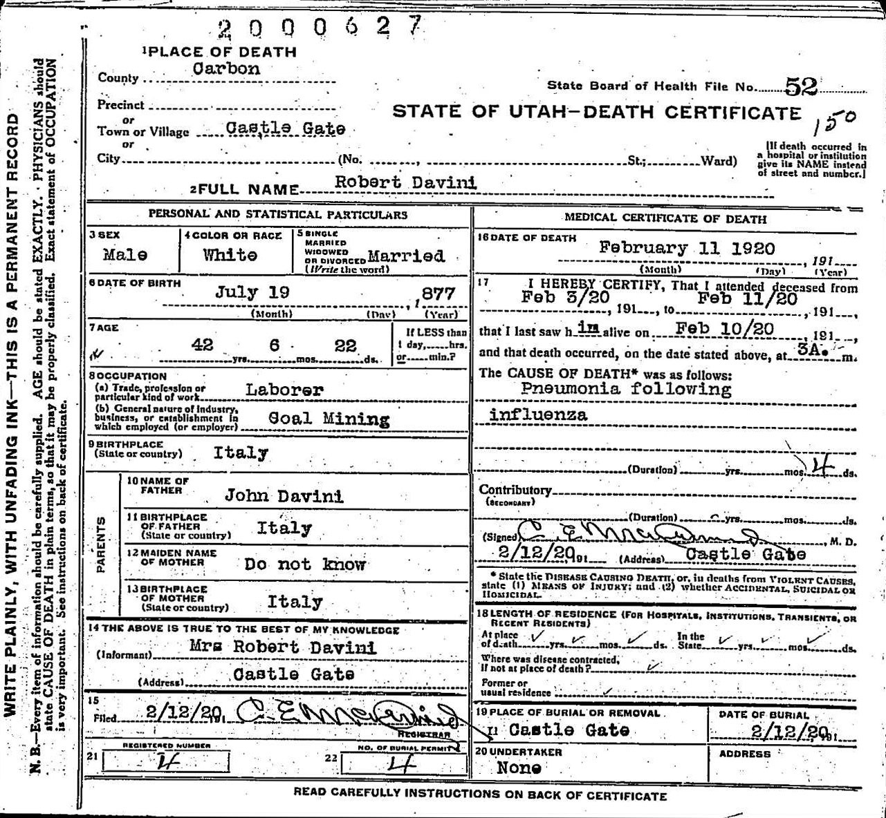 - 1920 Robert Davini death